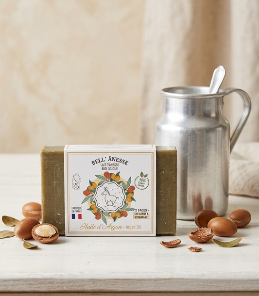 Jabón Facial Doble cara de Leche de Burra Biológica y Aceite de Argán Exfoliante-Hidratante