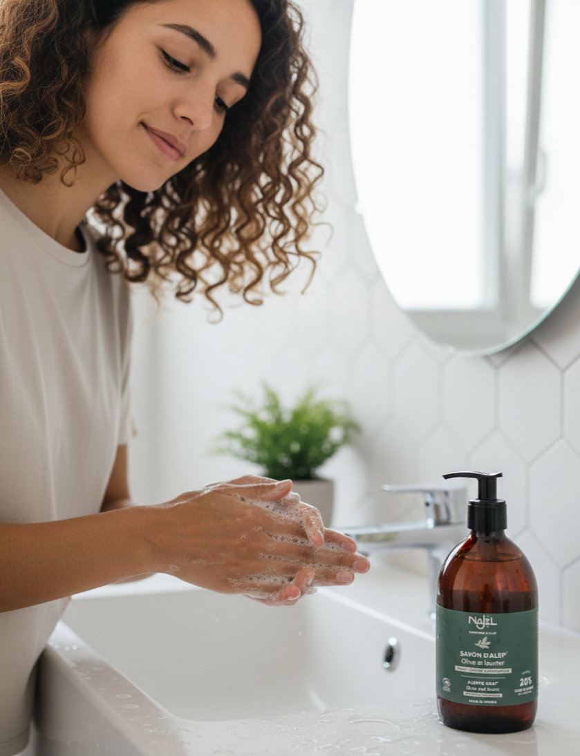 Descubre el Jabón Líquido de Alepo, elaborado con aceite de oliva y aceite de laurel, los mismos ingredientes del tradicional jabón de Alepo, brindando las mismas propiedades nutritivas y calmantes. Este jabón, enriquecido con un 20% de aceite de laurel orgánico, limpia suavemente la piel, dejándola suave, protegida y sin irritaciones, ideal para pieles secas y sensibles.